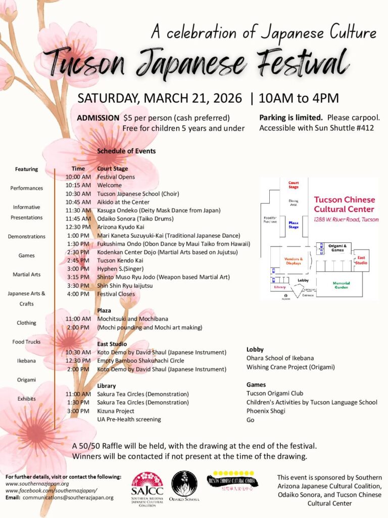 This is our 10th SAJCC sponsored Japanese Festival in Tucson, scheduled for Saturday March 21 at the Tucson Chinese Cultural Center, 1288 W. River Rd.