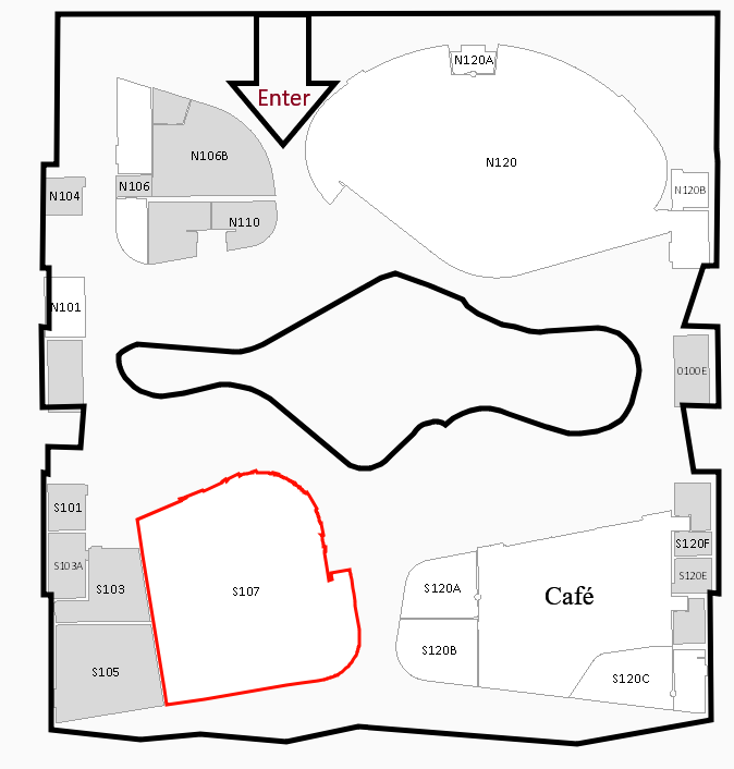 I located a map of ENR2 building with entrance on north side on Lowell St. Entrance from the east side is from the parking garage & bike racks, and free Sun Tran bus #3 also runs along the south side on E. 6th St. Room S107 is on the southwest side, see image below.